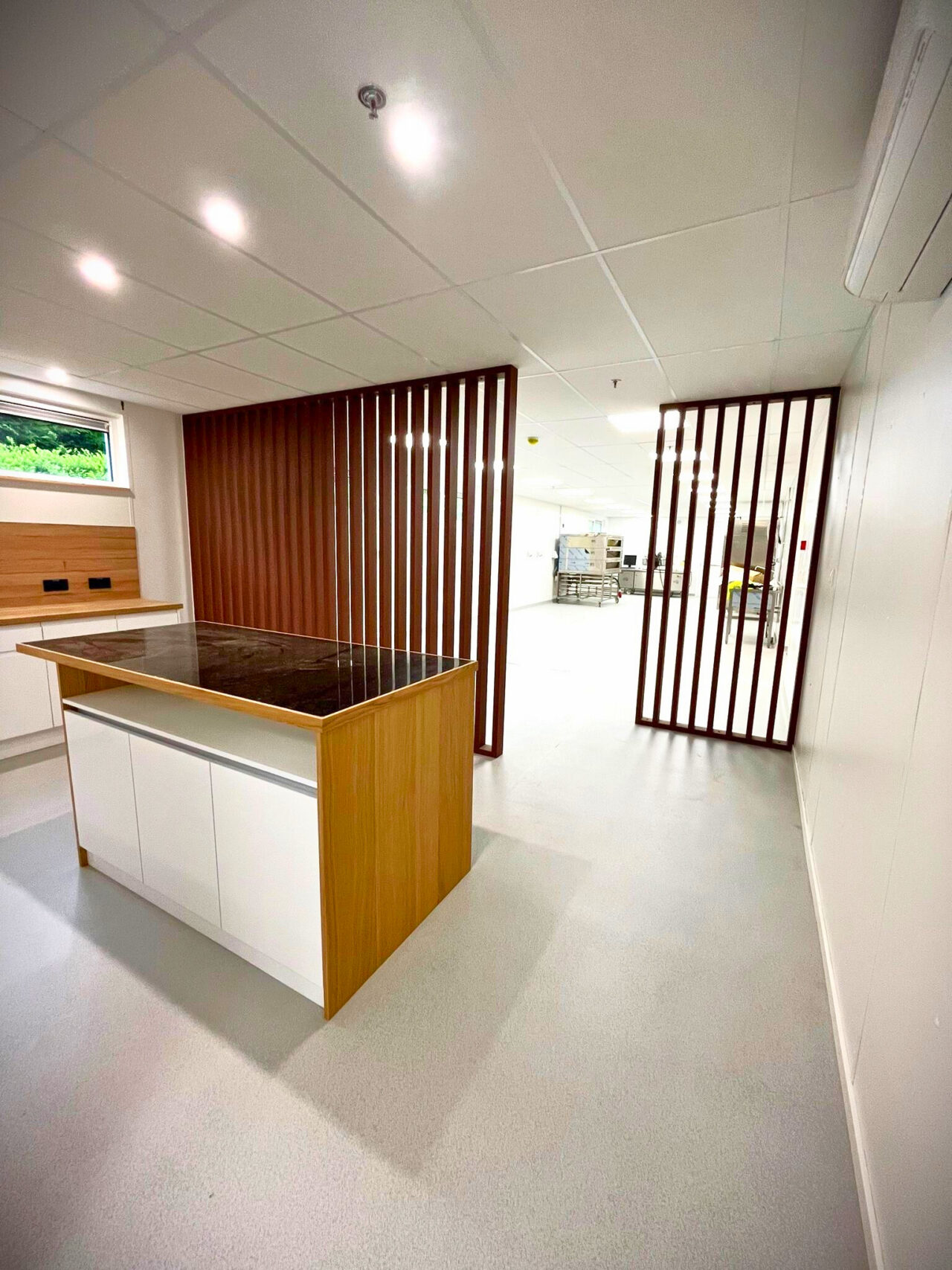 À l’intérieur, les aménagements ont été pensés pour allier fonctionnalité et qualité perçue. Les cloisons vitrées avec châssis bois apportent élégance et transparence, favorisant la diffusion de la lumière naturelle, tandis que les portes en panneaux HPL assurent robustesse et facilité d’entretien au quotidien.